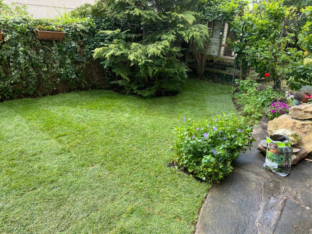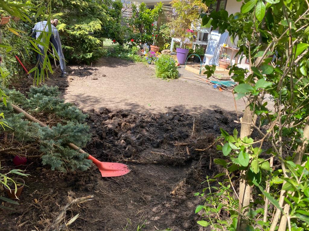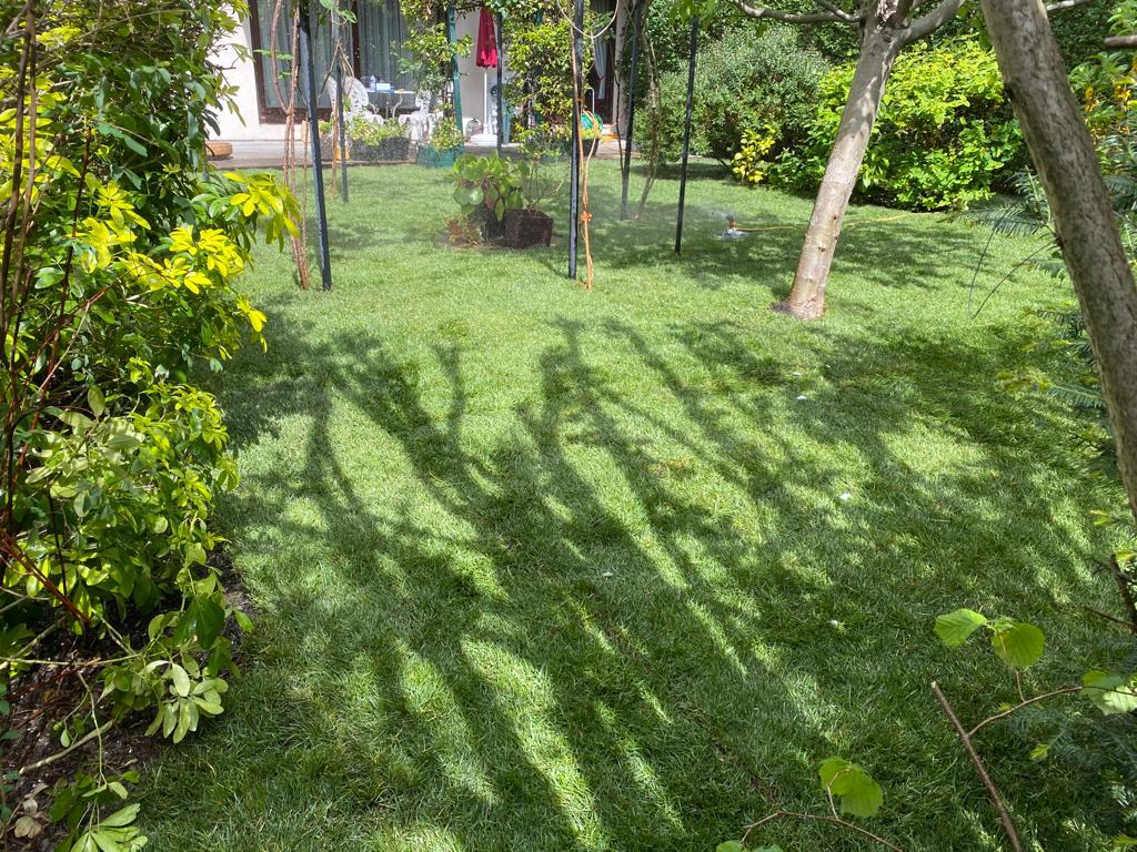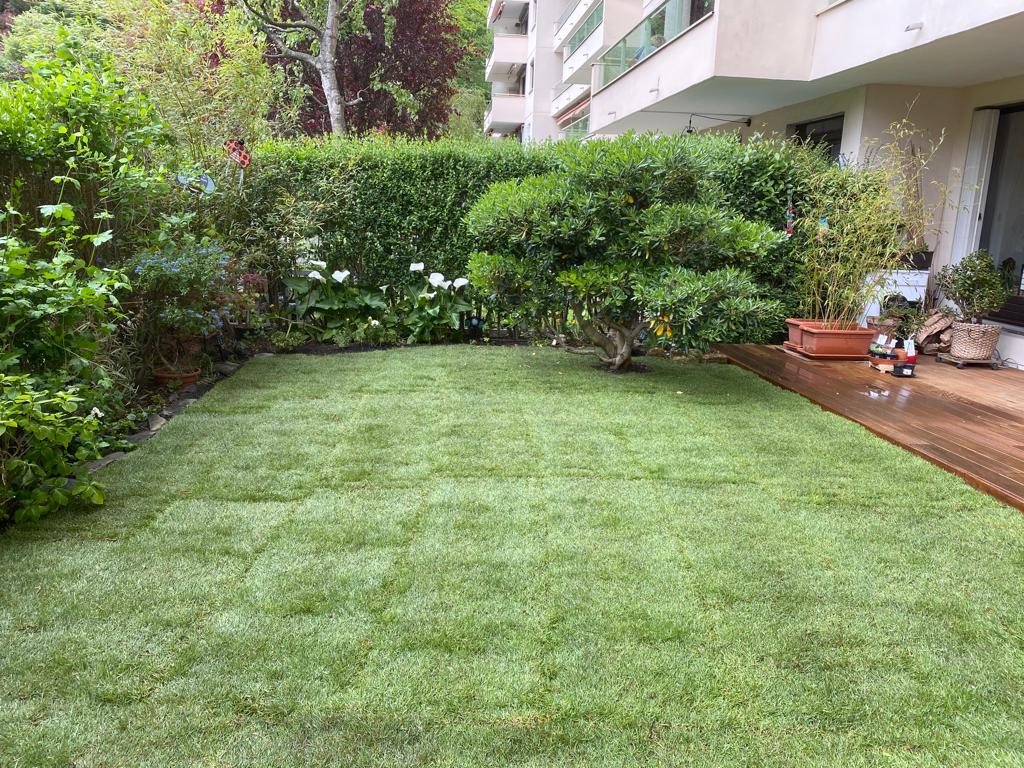 Nous sommes intervenus à L'Isle-Adam en Val d'Oise pour réaménager le jardin de cette propriété, avec pose de grandes surfaces de gazon en rouleaux.